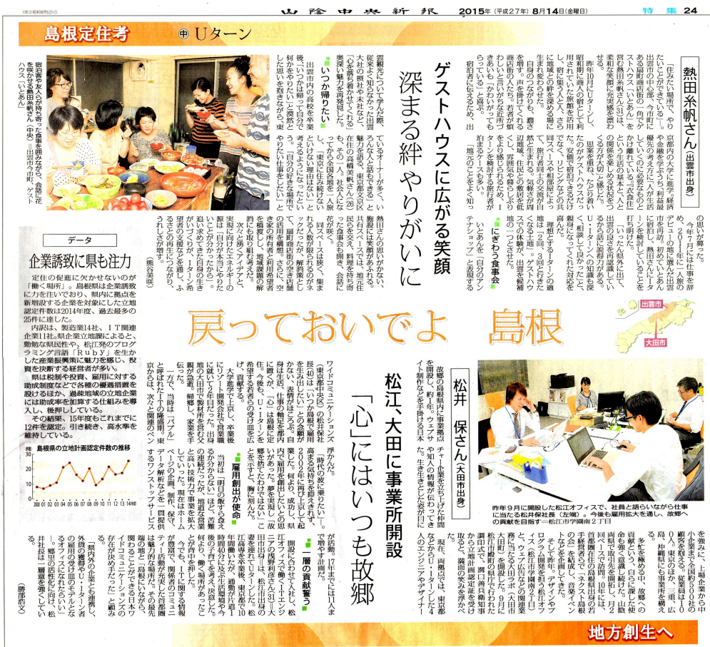 「山陰中央新報」に掲載されました。 2015年08月14日 お知らせ 島根県松江市、大田市に事業所を開設した様子が「山陰中央新報」に掲載されました。 150814_山陰中央新報_島根定住考ワイド島根記事