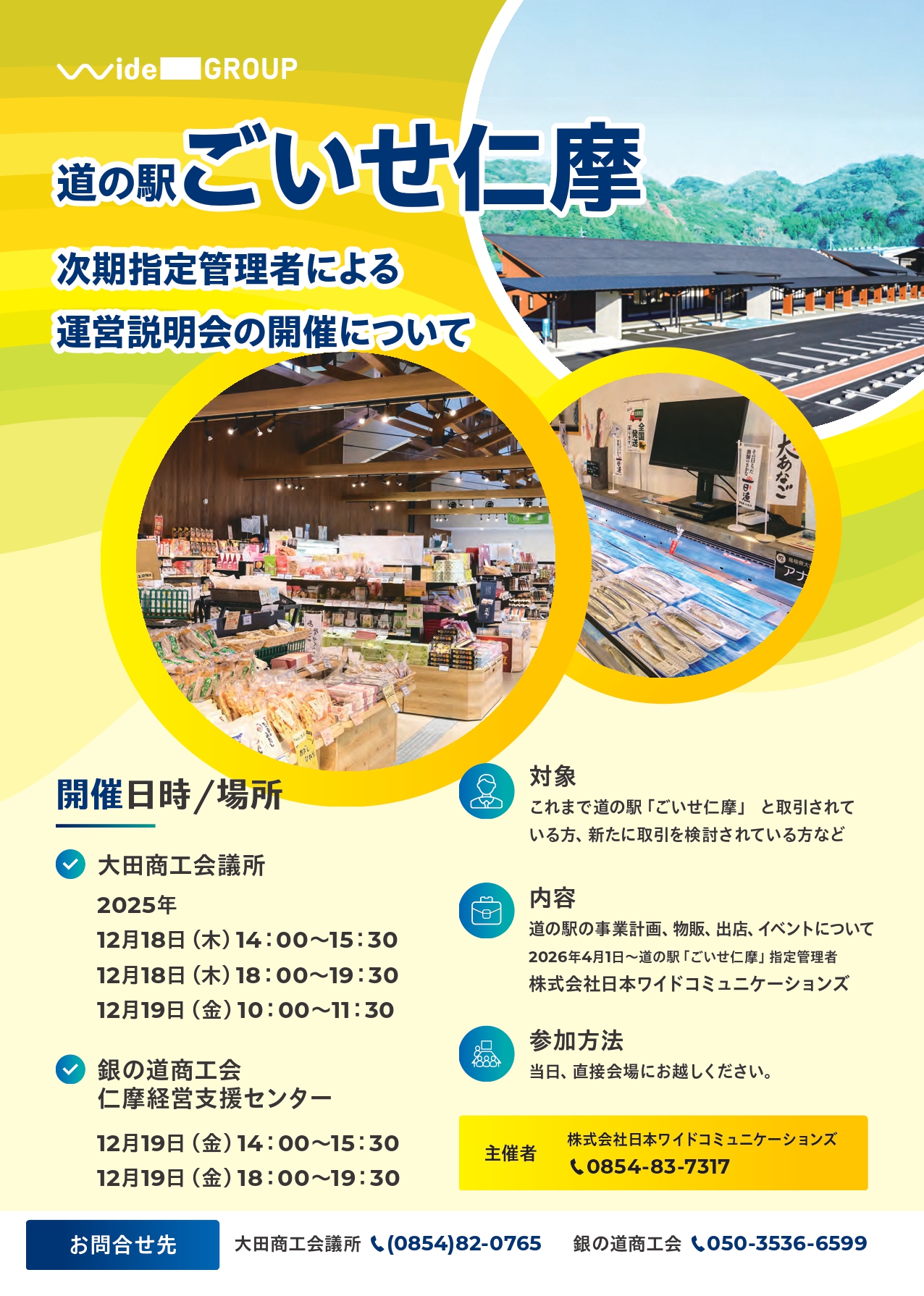 お取引中の事業者さまはもちろん、これから関わってみたい方など、道の駅ごいせ仁摩のこれからの運営に興味のある方はどなたでもお気軽にご参加ください。